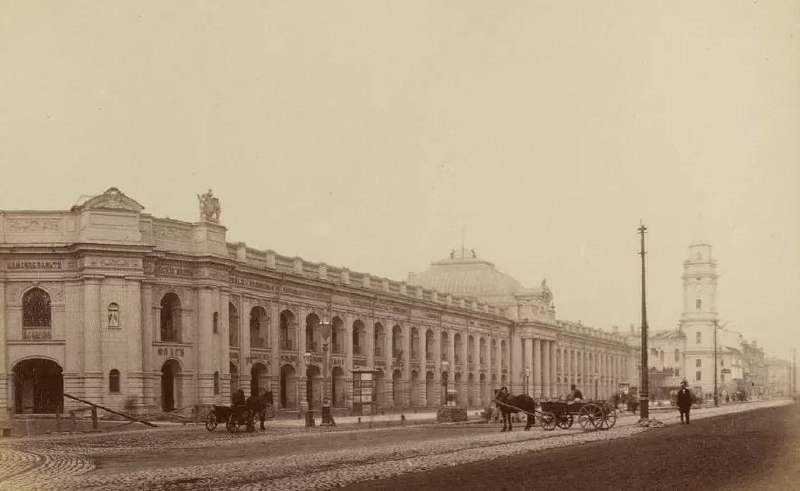 Гостиный двор. На Невском проспекте идёт установка электрического освещения. Санкт-Петербург. 1888 год Российская империя