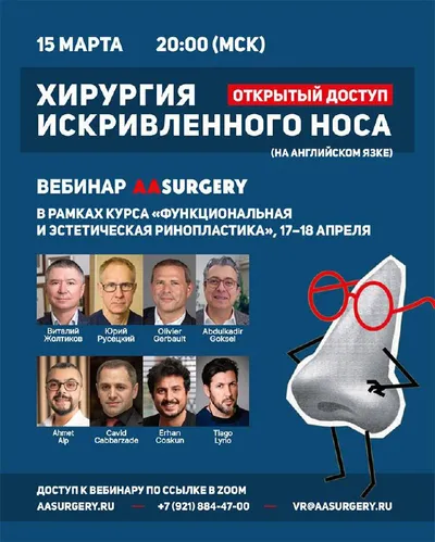 Вебинар – ХИРУРГИЯ ИСКРИВЛЕННОГО НОСА 15 марта | 20:00 (МСК) Виталий Жолтиков, Юрий Русецкий, Olivier Gerbault, Abdulkadir Goksel, Ahmet Alp, Cavid Cabbarzade, Erhan Coskun, Tiago Lyrio 👉 Ссылка для
