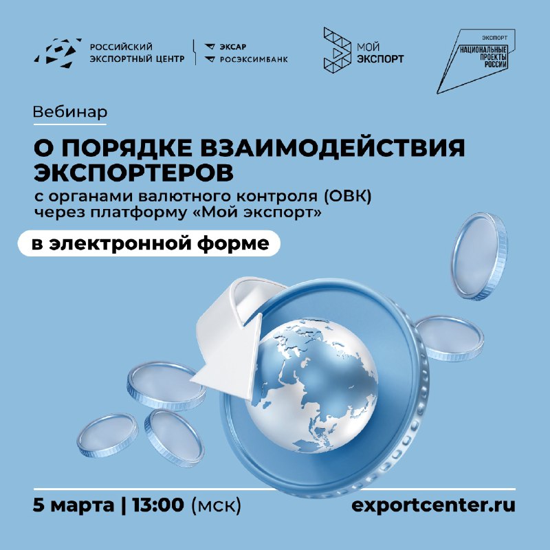 ⚡️️ Это должен знать каждый экспортер! РЭЦ приглашает на вебинар по валютному контролю! 🧑💻 Вы узнаете о требованиях валютного законодательства для пользователей платформы «Мой экспорт»! 📅 Дата: