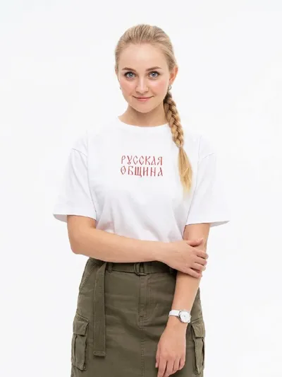 Новинка к теплому сезону специально для девушек РО! ❤️ Футболка «Русская краса» с принтом «Русская община». Принт выполнен со стилизацией под древнерусскую вязь. Особенности модели: • Сзади футболк