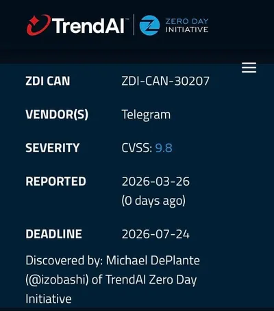 ✋ На официальной странице Zero Day Initiative (ZDI) появилась заметка про 0-day (ZDI-CAN-30207) — 👀 критическую уязвимость в Telegram с оценкой CVSS 9.8 Исследователь Майкл ДеПланте (Michael DePlant