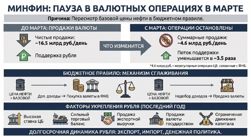 Минфин объявил, что в марте не будет проводить операции по покупке или продаже валюты и золота на внутреннем рынке в рамках бюджетного правила. Причина - обсуждение пересмотра базовой цены нефти, кот