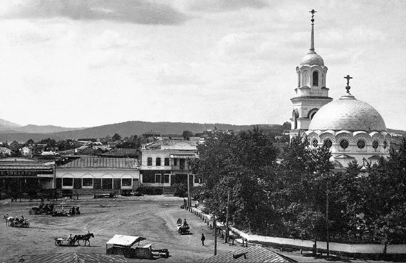 Церковная площадь Миасского завода. Петропавловская церковь, главный храм города Миасса. Оренбургская губерния, 1900 год Неизвестный автор. Государственный исторический музей Южного Урала 🤩 Российс
