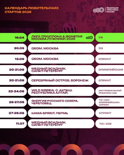📅 Календарь любительских стартов по триатлону 2026 Мы собрали подборку соревнований по триатлону, на которые точно стоит обратить внимание в новом сезоне. В нашем календаре — проверенные старты с хо