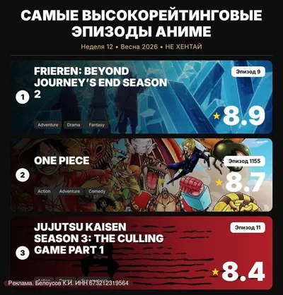 НЕ ХЕНТАЙ Опубликовали топ эпизодов недели 🏆 Топ-6 эпизодов недели • «Провожающая в последний путь Фрирен 2» - Эп.9 ⭐️ 8.9 • «Ван Пис» - Эп.1155 ⭐️ 8.7 • «Магическая битва: Смертельная миграция 3» -