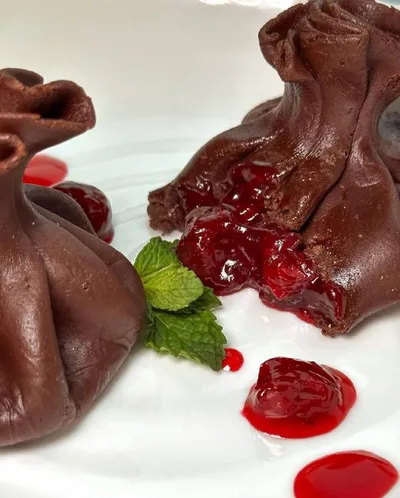 В кафе «Кинза» в Городских рядах начали готовить шоколадные хинкали с начинкой из вишнёвого конфи и шоколадно-ореховой пасты. Стоимость десерта ₽490. @mediarzn