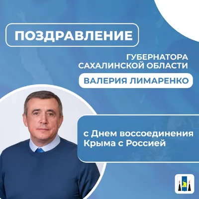 Поздравление губернатора Сахалинской области Валерия Лимаренко с Днем воссоединения Крыма с Россией Уважаемые сахалинцы и курильчане! Сегодня мы отмечаем День воссоединения Крыма с Россией. 18 ма