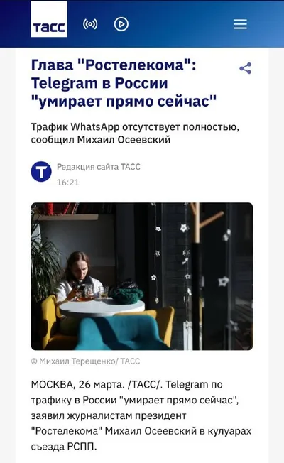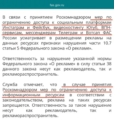ТАСС постит новость, из которой следует, что реклама в Телеграме и Ютубе разрешена, но вот если их заблокируют — тогда а-та-та. И ТАСС ссылается на пресс-релиз ФАС, в котором действительно есть такой