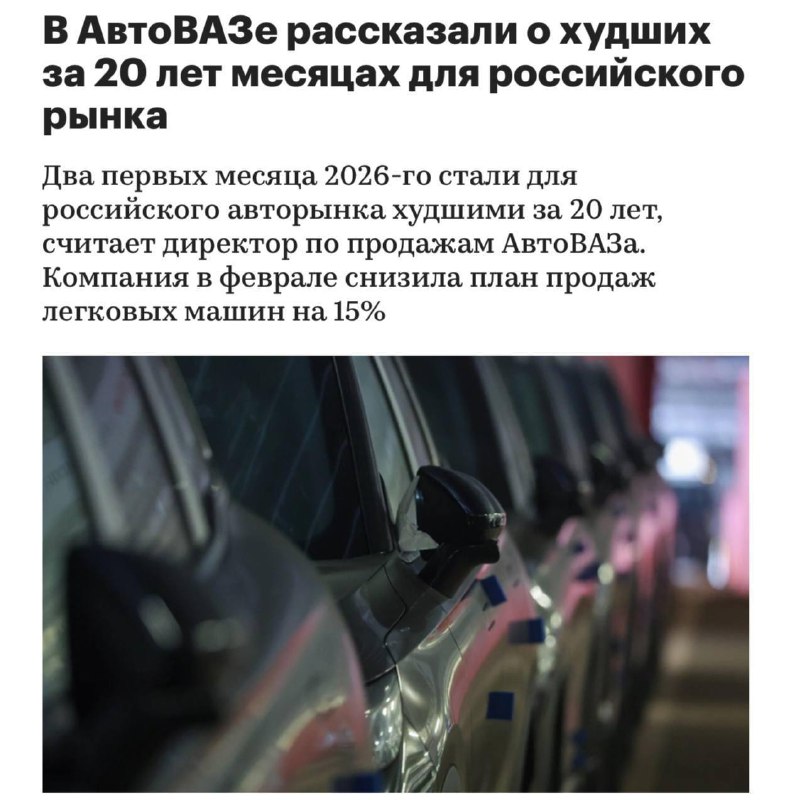 АвтоВАЗ назвал ситуацию на рынке худшей за последние 20 лет Январь и февраль 2026 года стали для российского авторынка худшими за два десятилетия ведения статистики, заявил директор по продажам и мар
