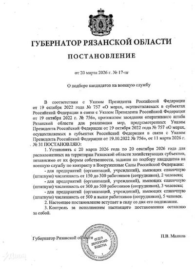 ⚠️ Кажется, началось: на рязанские предприятия повесили план по вербовке — губернатор Павел Малков обязал местный бизнес искать контрактников для «СВО» Для бизнеса введён чёткий план, который необход