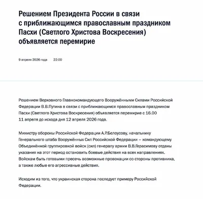 Владимир Путин объявил пасхальное перемирие, сообщили в Кремле. Перемирие действует с 16.00 11 апреля до конца дня 12 апреля 2026 года.