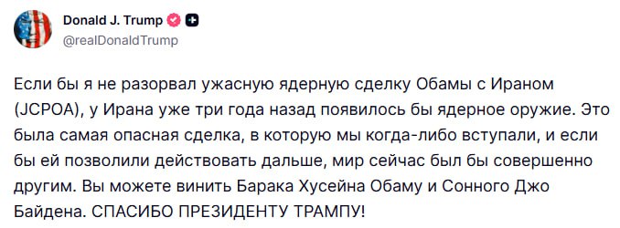 Трамп: если бы я не разорвал ядерную сделку Обамы с Ираном, у Тегерана уже три года назад появилось бы ядерное оружие. По словам Трампа, это была самая опасная сделка, в которую США когда-либо вступа