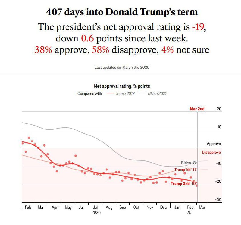 Рейтинг одобрения Трампа упал до 38%, при этом 58% не одобряют его — Economist 🇺🇸Дядя Сэм