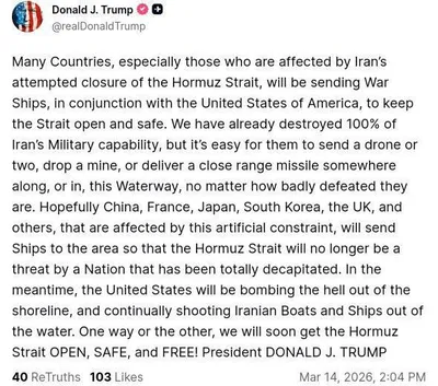 Трамп: Многие страны отправят военные корабли, чтобы обеспечить безопасность Ормузского пролива. Мы уже уничтожили 100% военных возможностей Ирана, но они все еще могут отправить один или два дрона и