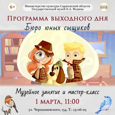 #МузейДетям ПРОГРАММА ВЫХОДНОГО ДНЯ 1 марта 11:00 Предлагаем юным любителям загадок отправиться в мир детективных историй. В воскресенье в музее вас ждет встреча с любимыми книжными сыщиками.
