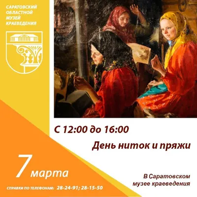 7 марта – День ниток в Саратовском музее краеведения! Изучай программу, записывайся на мероприятия, узнавай и создавай новое! Программа опубликована на сайте музея: http://www.comk.ru/ad/NewsDetail.a