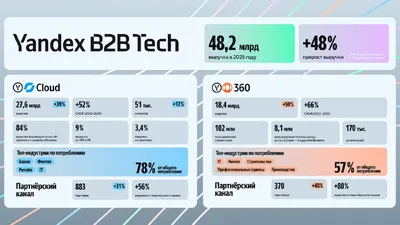 ❤️ Отчет Yandex B2B Tech: выручка увеличилась в 1,5 раза, Яндекс 360 наращивает темпы роста доходов и насчитывает 102 млн пользователей ежемесячно Выручка Yandex B2B Tech в 2025 году увеличилась на +