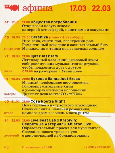 «Ща» Казань, Щапова, 26Д Бронь столов: +7 (937) 282-01-87 Меню и карта бара: hipolink.net/scha По вопросам выступлений: @brbvlg ООО «ПУЗЫРИ НАДЕЖДЫ» ИНН 1655460025 ОГРН 1211600049495