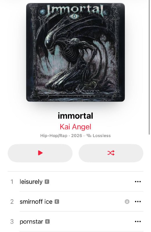 кто-то залил «immortal» на карточку музыканта kai angel в apple music сам «релиз» полностью из анрелизов, дропнутых ранее в тг, а также удалённых треков