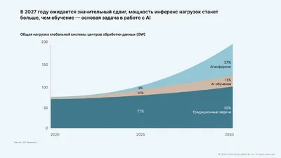 По данным консалтинговой компании JLL, к 2030 году половина нагрузок дата-центров будет приходиться на AI Согласно прогнозам, глобальный рынок дата-центров будет расти на 14% ежегодно до 2030 года, з