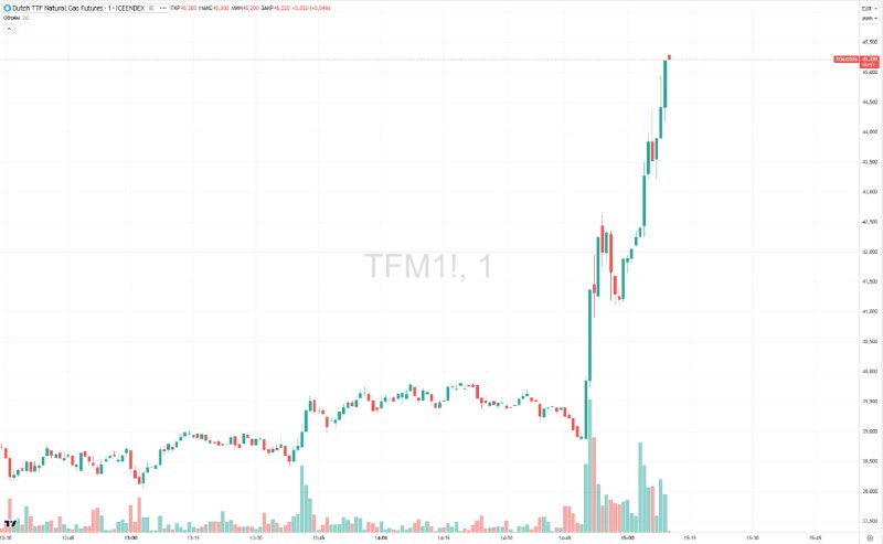 🕯 Цены на газ в Европе взлетели почти на 30% до уровней января 2023 года Ситуация на Ближнем Востоке спровоцировала ралли не только в ценах на нефть, но и на газ. После того как ночью цена Brent дох