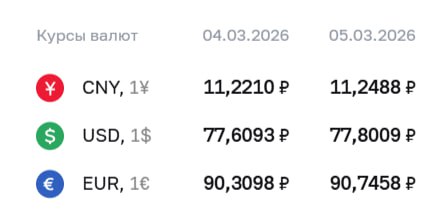💲ЦБ повысил курс доллара на 19 копеек, евро — на 44 копейки Доллар вырос до максимума с 21 января. Официальный курс валют на четверг, 5 марта: 🔺 доллар — ₽77,80 (+₽0,19); 🔺 евро — ₽90,75 (+₽0,44