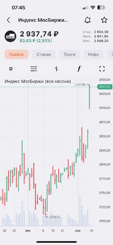 ⏺ Индекс Мосбиржи превысил 2900 пунктов впервые за последние полгода Индекс IMOEX2, отражающий динамику основной и дополнительной сессий Мосбиржи, на утренних торгах 9 марта растет на 2,93% и находит