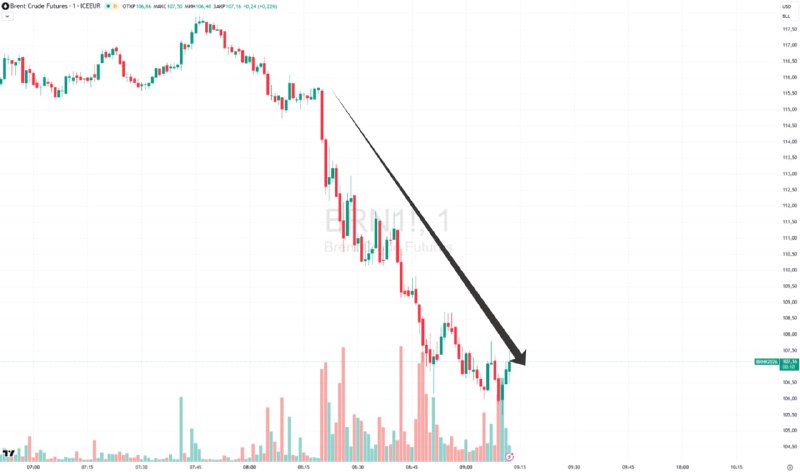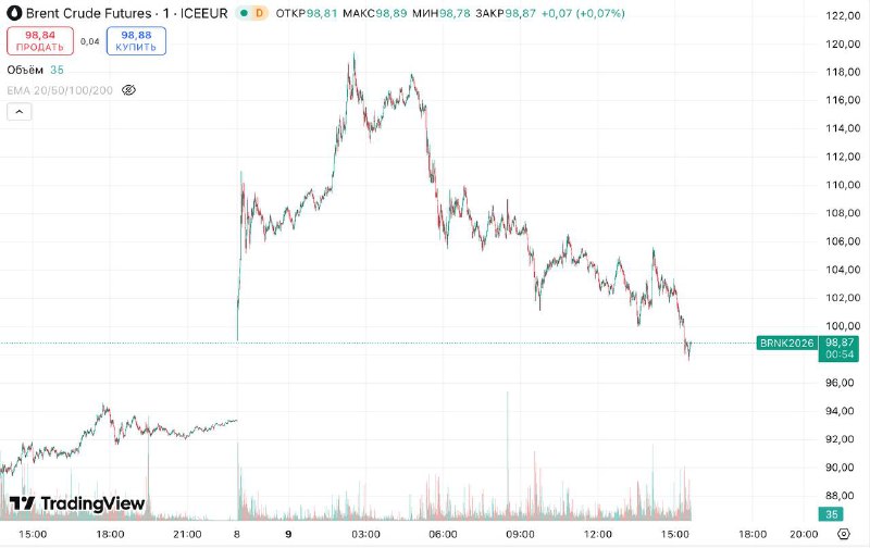 🛢️Цена нефти Brent упала ниже $100, хотя на максимуме доходила до $119,5 На 19:03 мск майский фьючерс Brent на лондонской бирже ICE прибавляет 7,14% к закрытию предыдущего торгового дня и находится