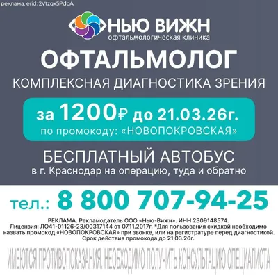 Реклама. erid: 2Vtzqx5PdbA Рекламодатель: Общество с ограниченной ответственностью «Нью-Вижн» ИНН 2309148574; ОГРН 1152309004517