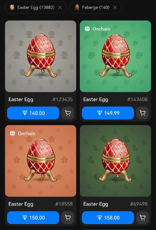 а вы знали, что всего яиц Faberge на черном 18 штук на 1.000.000.000 юзеров Telegram, при этом одно на удаленном аккаунте. т.е в рынке 17. у меня 3 + 1 у товорища. минимальный флор 4000 TON. т.е.
