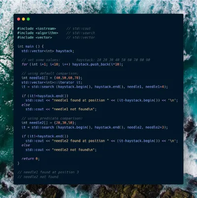 Алгоритм search Ищет последовательность [first1, last1) для первого вхождения подпоследовательности, определенной [first2, last2), и возвращает итератор в свой первый элемент вхождения, или last1, ес