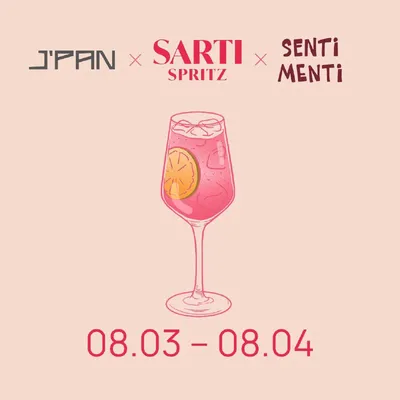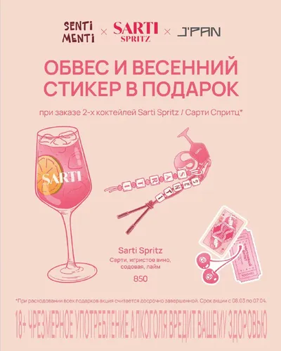 Весенний сезон J’PAN × SENTI MENTI × SARTI 🌸 Открываем весенний сезон и дарим подарки: 💞 При заказе двух коктейлей Сарти Спритц (850₽) в SENTI MENTI или J’PAN подготовили стильный стикер и брендир
