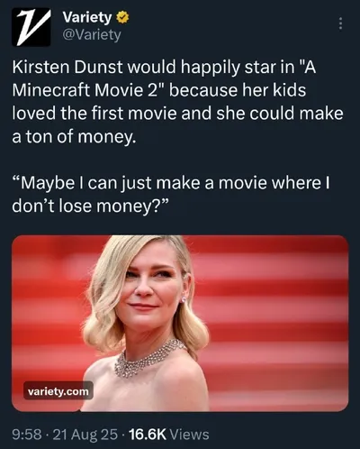 Кирстен Данст хотела сняться в сиквеле «Майнкрафта», чтобы порадовать своих детей и заработать деньжат. Кирстен Данст снимется в сиквеле «Майнкрафта». Будьте как Кирстен Данст.