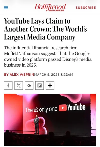 YouTube заработал на рекламе $40,4 млрд — это больше, чем Disney, NBC, Paramount и Warner Bros. вместе взятые. По сути, это делает платформу крупнейшей медиакомпанией в мире. Ютуб шортс забирает рыно