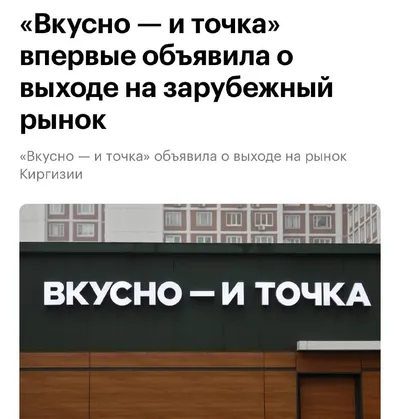 «Вкусно — и точка» теперь не только в России. Ресторан откроет первое заведение за пределами России — в Киргизии. В течение 5 лет там откроется ещё 15 ресторанов. McDonald`s, за тобой вышли 😂