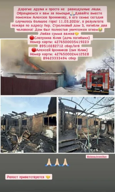 Сегодня нам поступила тревожная информация с отделения «Северный человек» Лесозаводск. 11.03.2026 в результате пожара погибли два человека, дом был полностью уничтожен огнем. Юлия ( знакомая нашего р