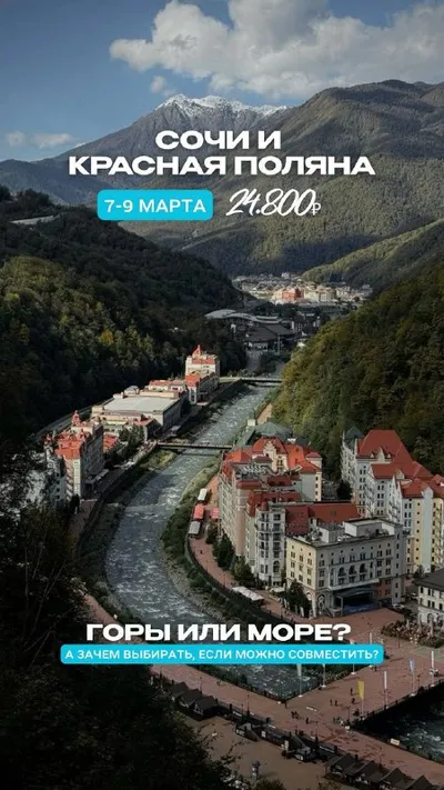СОЧИ + КРАСНАЯ ПОЛЯНА: ТРИ ДНЯ СЧАСТЬЯ НА 8 МАРТА ☀️🏔️ 📆 7-9 марта 💰 24.800₽ Весна начинается здесь! Надоел классический спор: пляжный отдых или горный? Мы нашли идеальный баланс в туре выходного