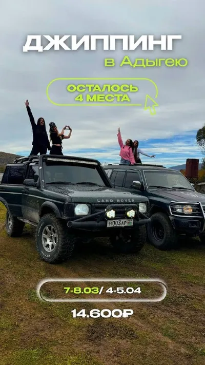 ОСТАЛОСЬ ВСЕГО 4 МЕСТА на 7–8 МАРТА! 🔥 ГОРЫ. ДРАЙВ. ДВОЕ СУТОК ВНЕ РЕАЛЬНОСТИ 🚙💨 Хватит смотреть на горы в экране телефона. Садись в джип — поехали по-настоящему! Адыгея — это не просто природа.