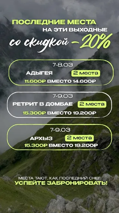 🔥 Последние места на эти выходные СО СКИДКОЙ 20% 📆 7-8.03 ⛰️ Адыгея - 2 места 🔥 11.600₽ вместо 14.600₽ 📆 7-9.03 ⛰️ Ретрит в Домбае - 2 места 🔥 15.300₽ вместо 19.200₽ 📆 7-9.03 ⛰️ Архыз - 2 мес