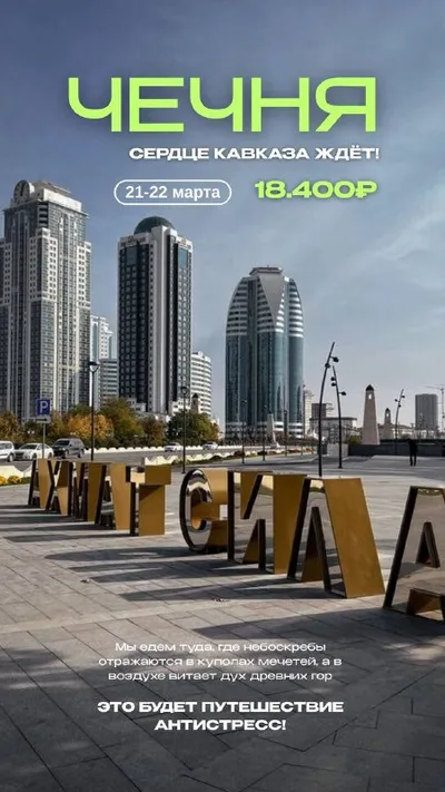 ЧЕЧНЯ 🕌 ТУДА, КУДА ХОЧЕТСЯ ВЕРНУТЬСЯ ❤️🏔 📆 21-22 марта 💰 18.400₽ Что нас ждет: 🏙 ГРОЗНЫЙ: Гуляем по сияющему проспекту Кадырова, парку цветов и скверу Журналистов 🕌 Поднимаемся на смотровую