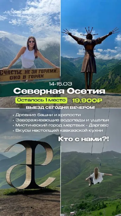 Осталось 1 место 😱 Завораживающее путешествие в сердце Кавказа - Северную Осетию ❤️🔥 уже в эти выходные всего за 19.900₽ Кто с нами?! ВЫЕЗД СЕГОДНЯ ВЕЧЕРОМ 🚍 ЗАБРОНИРОВАТЬ