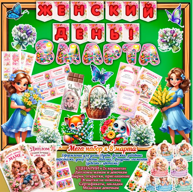 ✅🌷 Мега-набор к 8️⃣ марта — всё для яркого праздника в одном комплекте! Включает: 🌷 Сценарии к 8 марта — 3 готовых варианта для любого формата: 1⃣ Классический — с играми, стихами, песнями и тёплы