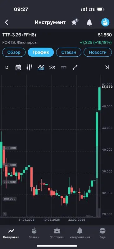 TTF 50 UPD: продал 26 контрактов все-таки выше 50, по 51,85. Теперь жду 100 и 250. Еще 100 контрактов TTF остались. Пирамидить буду в старом добром фьюче на доллар 😂
