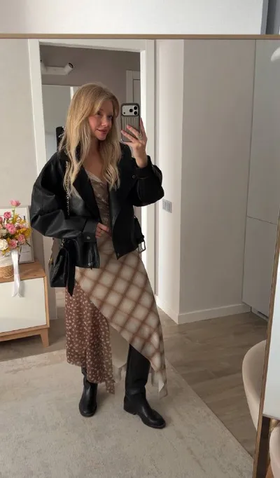 Платье из вчерашней подборки можно носить по-разному, например, увести в бохо с казаками или же «програнжевать» с косухой Вы за какой?) ❤️ - черная куртка 💅🏻 - бомбер телеграмм замедляют, оста
