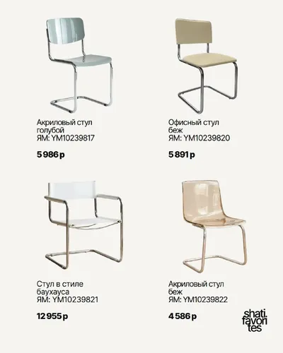 Стулья🤍 Симпатичные! 1/ Акриловый стул 2/ Офисный стул 3/ Стул в стиле баухаус 4/ Акриловый стул 5/ Прозрачный стул 6/ Стул с обивкой 7/ Пластиковый стул 8/ Стул букле