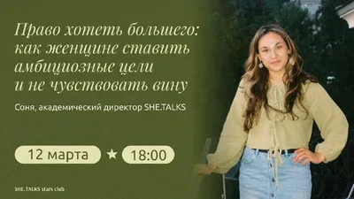 Право хотеть большего 12 марта 18:00 по МСК, онлайн-лекция от методического отдела SHE.TALKS в нашем закрытом сообществе Поговорим о праве хотеть большего: как женщине ставить амбициозные цели и н