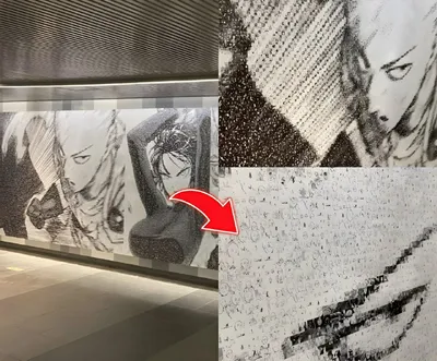 Очень классный постер «Ванпанчмена» в Японии. В честь франшизы на станции Сибуя был установлен гигантский постер. Удивительно, что изображение Сайтамы составлено из ста тысяч крошечных кадров из ман