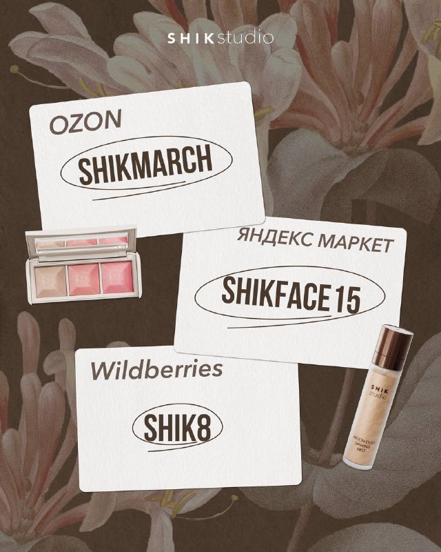 Дарим скидку 15% на маркетплейсах в честь 8 марта! Подготовили для вас промокоды, которые будут действовать только 8 и 9 марта. 🌸Промокод SHIKMARCH — OZON; 🌸Промокод SHIKFACE15 — Яндекс Маркете; �
