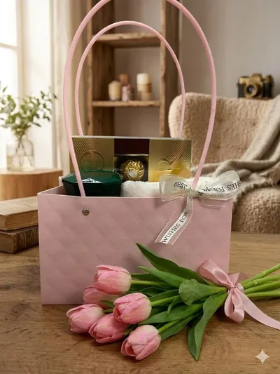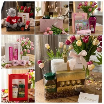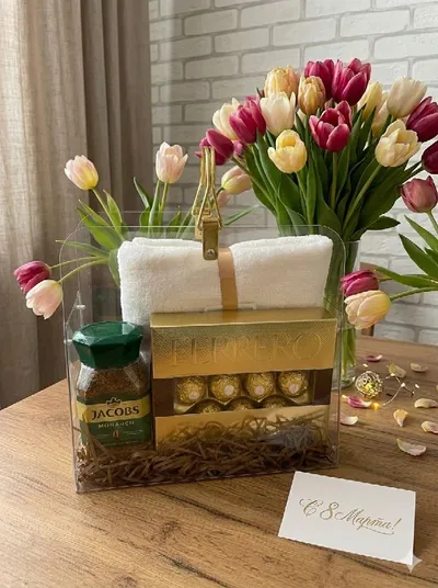 Подарочный набор к 8 Марта. Нежная стильная корзина с красивым наполнением и весенними тюльпанами — элегантный подарок, который приятно дарить и получать. В наборе: ✨ конфеты Ferrero Rocher ✨ арома