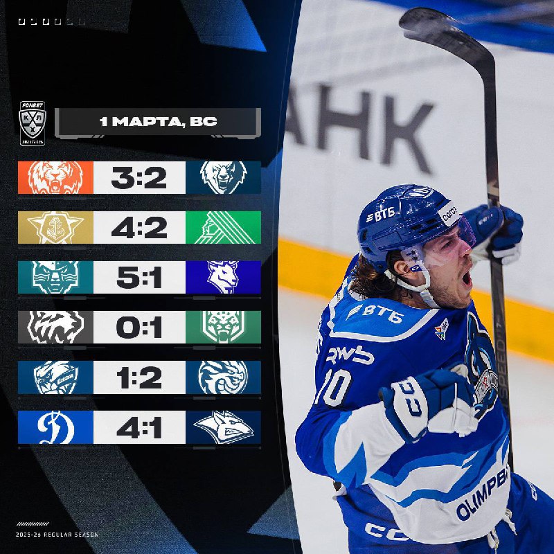 🏒 Результаты прошедшего игрового дня в КХЛ: 3:2 | Амур 🐅 – Нефтехимик 🐺 4:2 | Адмирал ⚓️ – Салават Юлаев 🪒 5:1 | ХК Сочи 🐆 – Торпедо 🦌 0:1 | Трактор 🚜 – Ак Барс 😼 1:2 | Лада 🦅 – Шанхай